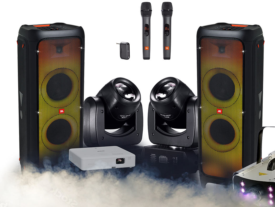 | Komplekte | 2x JBL PartyBox 1000, 2x JBL mikrofonai, 2x WASH, dūmų mašina projektorius ir reikalingi laidai. |