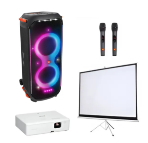| Komplekte | JBL PartyBox 310, 2x JBL mikrofonai, projektorius, vaizdo ekranas ir laidai. |